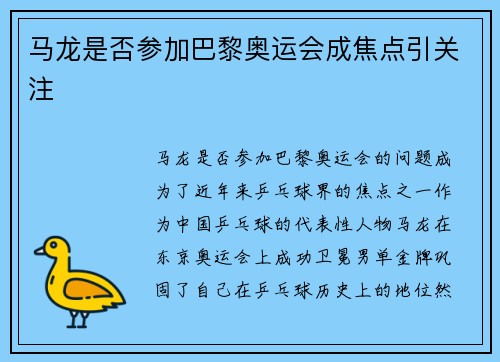 马龙是否参加巴黎奥运会的问题,成为了近年来乒乓球界的焦点之一。作为中国乒乓球的代表性人物,马龙在东京奥运会上成功卫冕男单金牌,巩固了自己在乒乓球历史上的地位。然而,随着巴黎奥运会的临近,关于他是否参赛...