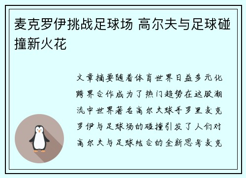 文章摘要:随着体育世界日益多元化,跨界合作成为了热门趋势。在这股潮流中,世界著名高尔夫球手罗里·麦克罗伊与足球场的碰撞,引发了人们对高尔夫与足球结合的全新思考。麦克罗伊通过挑战足球场,不仅展现了高尔夫...